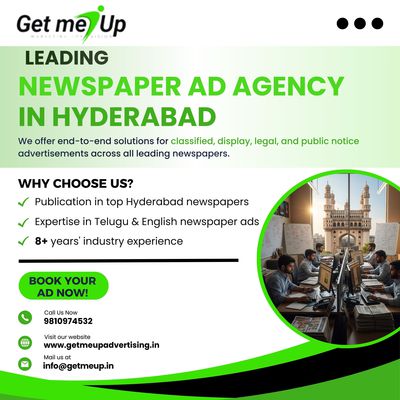 Get Me Up Advertising is one of the top newspaper ad agencies in Hyderabad with 8+ years of experience in creating all types of newspaper ads. We specialize in publishing ads in all major newspapers, ad categories including public notices to obituary ads, and ad types including Classified, classified display, and display ads. Our services include ad design, placement, and strategy tailored. Get maximum ROI with our affordable and impactful ads with our extensive experience in publishing regional ads. Get your newspaper ad published hassle-free in Hyderabad. Call now at +91-9810974532! Visit: https://getmeupadvertising.in/Hyderabad.html